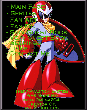 Ok, the site me and Alto have started (Mavrick Hunter Zone) its kinda up so you all can go to it if you want. I'm DONE with the fan fic (waits for the applause to die down) and I am currently writing it from paper to my pc so a while longer sorry. I made a 16-bit sprite with a bit of help from Alto so as soon as it gets converted from paint to jpg or gif you'll see it here. I'm also addin sprites like mad because I fornd my sprite disk again so if you want mega man, Proto Man, Bass, Duo, or Mega Man X i will have as many as can find. We got our first award from Gyroman for good HTML layout so i'm very happy!